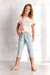 Хлопковая пижама для девочек Etna состоит из футболки и бридж. Футболка свободного кроя и с короткими рукавами. Бриджи с карманами, пояс на мягкой широкой резинке. Пижама декорирована принтом в виде надписи и звезд. Комплект идеально подходит для сна и в качестве домашнего костюма. В комплекте: футболка, бриджи.