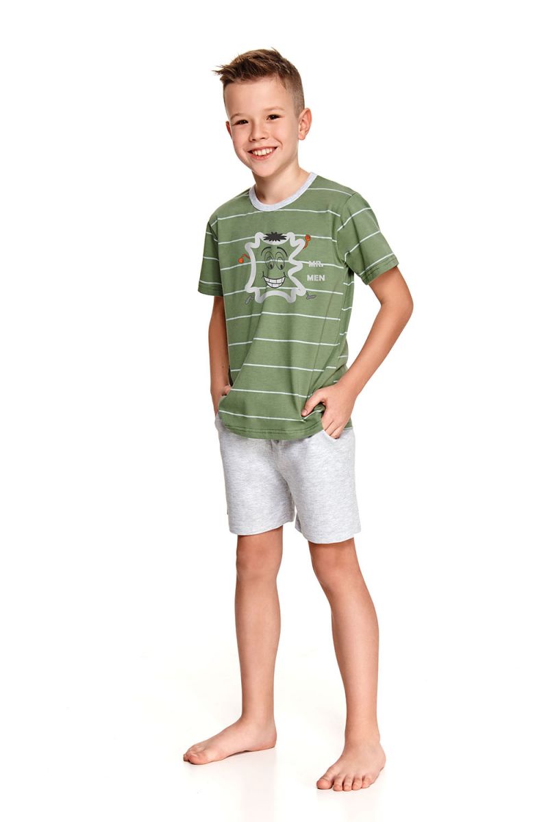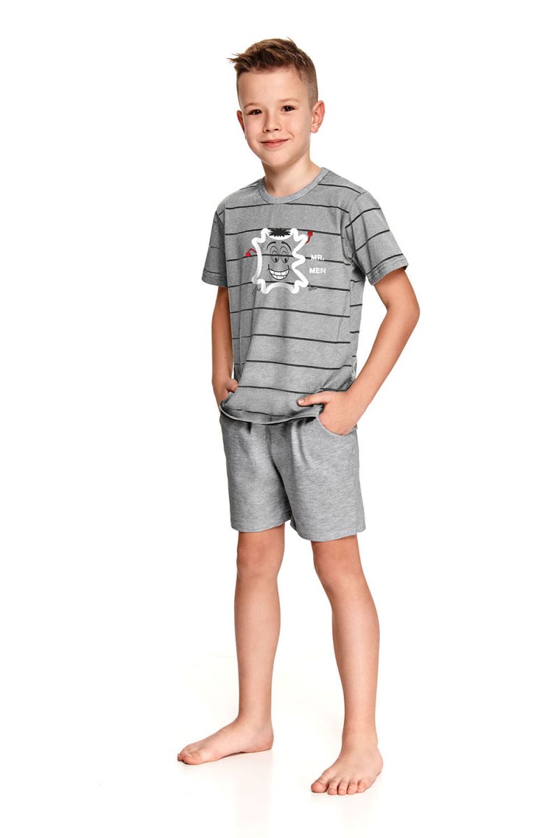 Хлопковая пижама Karolek для мальчиков состоит из футболки и шорт. Футболка свободного кроя, с круглым вырезом горловины, декорирована забавным принтом. Шорты с карманами, пояс на мягкой широкой резинке. Пижама идеально подходит для сна и в качестве домашнего костюма. В комплекте: футболка, шорты.