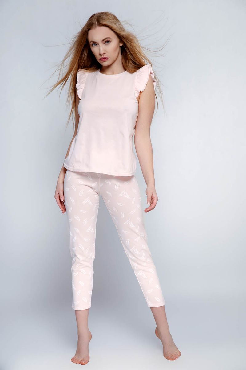 Хлопковая пижама Florencia состоит из майки на широких бретелях и укороченных брюк. Проймы рукавов декорированы широкой оборкой. Брюки на мягкой широкой резинке, украшены принтом «перышки». Идеальный вариант не только для сна, но и для домашнего отдыха. В комплекте: майка, брюки.