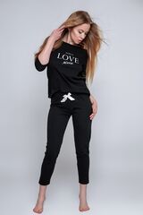 Хлопковая пижама La Belle состоит из лонгслива и укороченных штанов. Лонгслив свободного кроя с рукавами 3/4 и круглым вырезом горловины, декорирован принтом в виде надписи. Штаны немного зауженные к низу, пояс на мягкой широкой резинке, украшены атласным бантиком. Идеальный вариант не только для сна, но и для домашнего отдыха. В комплекте: лонгслив, брюки.