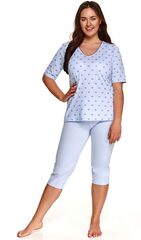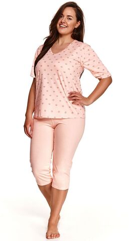 Хлопковая пижама Lidia для дам с пышными формами, состоит из футболки и бридж. Футболка свободного кроя и с короткими рукавами, декорирована принтом «ракушки». Бриджи на мягкой широкой резинке. Пижама идеально подходит для сна и в качестве домашнего костюма. В комплекте: футболка, бриджи.