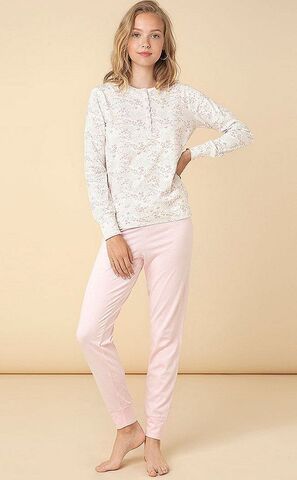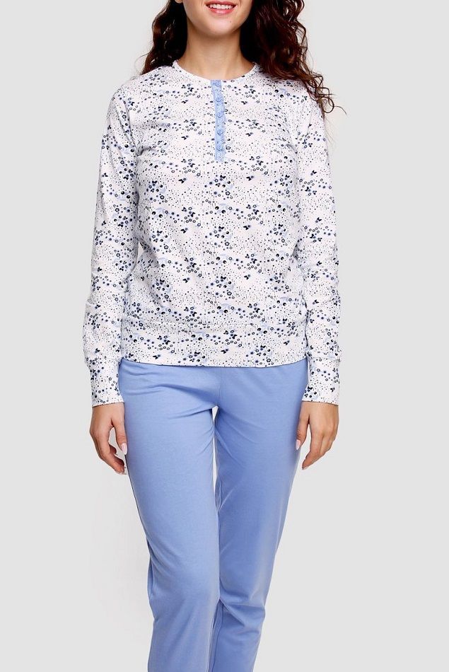 Женская трикотажная пижама из хлопка. Набивная майка с длинным рукавом с застежкой на планке и гладкие контрастные брюки. В комплекте: лонгслив, брюки.