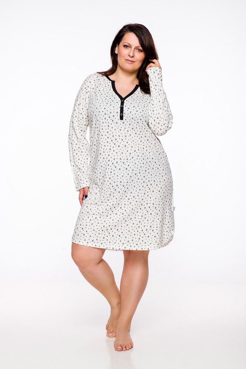 Сорочка Nika для дам с пышными формами выполнена из хлопкового полотна. Сорочка свободного кроя, с длинным рукавом, с V-образным вырезом горловины и планкой на кнопках. Изделие с принтом в виде сердечек. Сорочку можно использовать как домашнее платье.