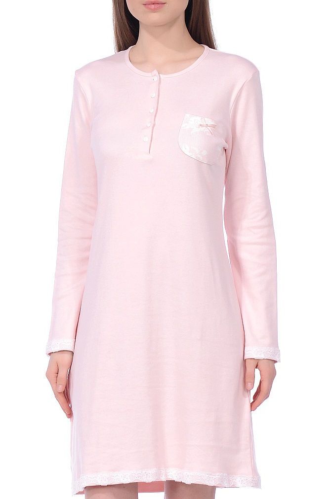 Платье-сорочка женская из хлопкового трикотажа. Вырез с застежкой на пуговицах, контрастный кармашек, отделка изделия и рукавов кружевом.