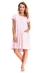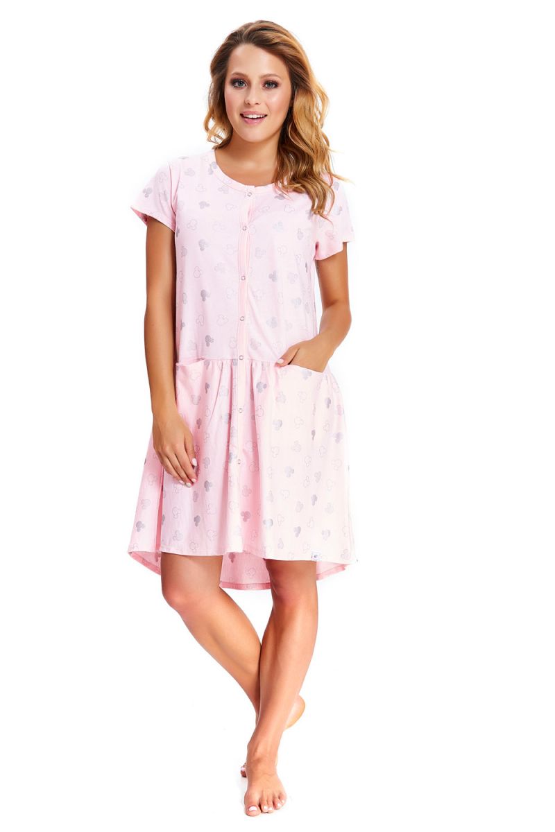 Сорочка свободного кроя, с удлиненной задней частью, круглым вырезом и планкой с пуговичками. Изделие выполнено с принтом Микки.