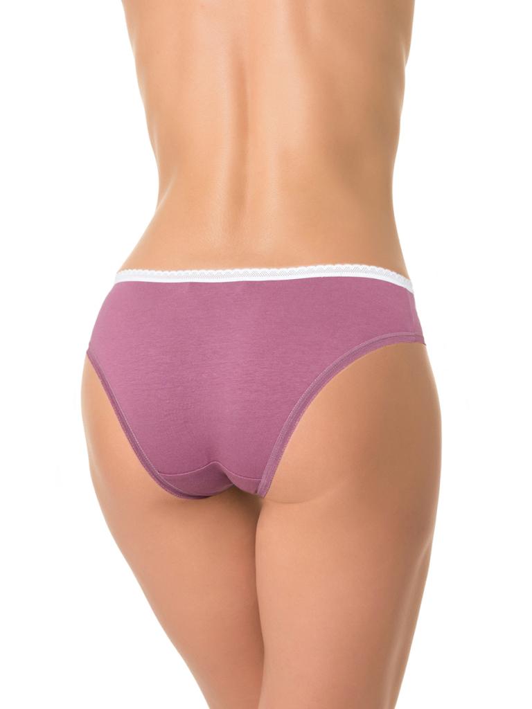 Трусы со средней линией талии, выполнены из деликатного хлопка со спандексом. Вырез ножки обработан эластичной тесьмой в цвет изделия. Талия отделана контрастной узкой кружевной резинкой. Декор - акцентный бантик. Хлопковая ластовица.