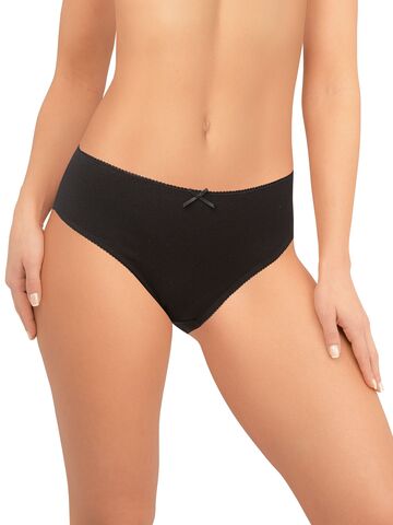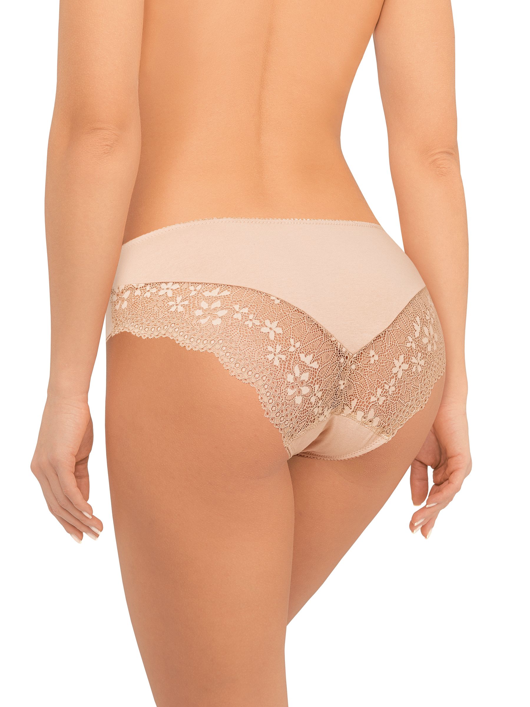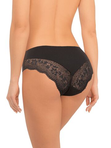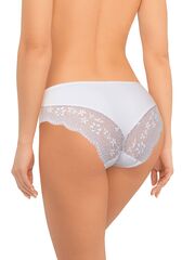 Трусы-слип со средней линией талии, выполнены из хлопкового полотна с содержанием эластана. Задняя деталь из мягкого кружева с цветочным рисунком. Линия талии и вырезы ножек обработаны эластичной тесьмой с деликатным фестончатым краем. Хлопковая ластовица.