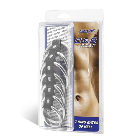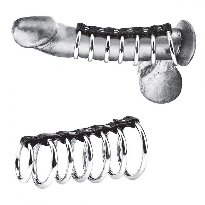 Тяжелый хомут на пенис из черной эко-кожи с 7 металлическими кольцами. Самое большое кольцо одевается за мошонку, остальные - на член. Длина ремешка - 12 см.