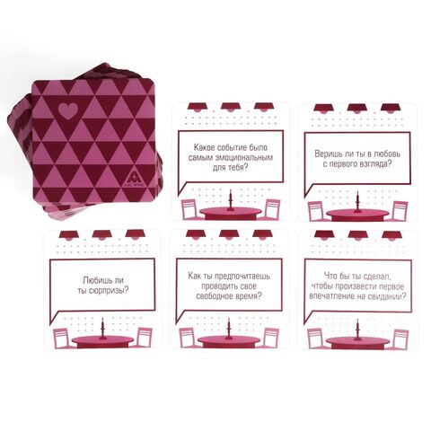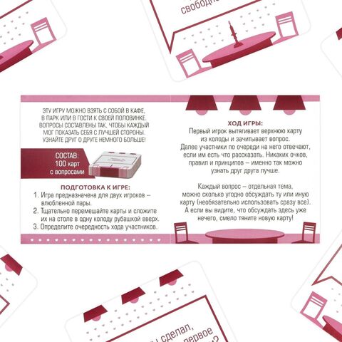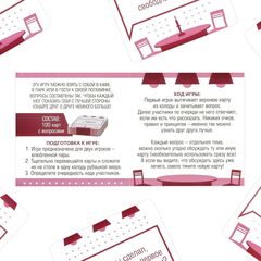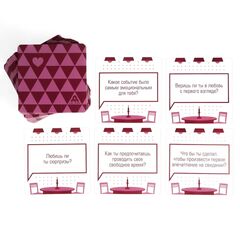 Как играть? По очереди вытягивайте карты из колоды и зачитывайте вопрос. Далее по очереди на него отвечайте. Никаких очков, соревнований и определения победителей. Просто карты для развития диалога и сближения.