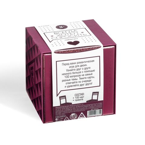 Это романтическая игра для двоих, которую можно взять с собой в кафе, парк или в гости к своей второй половинке. Узнайте друг о друге немного больше с помощью 100 вопросов на самые разные темы.