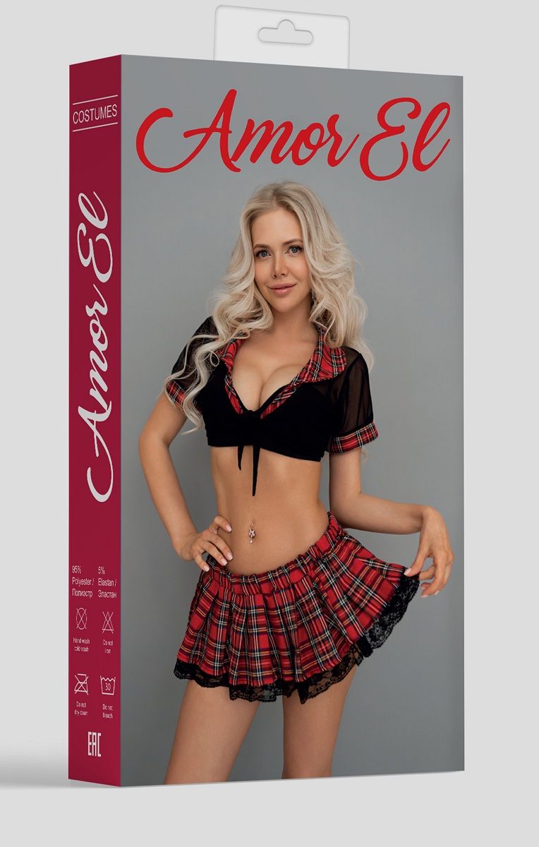 Игровой костюм дерзкой школьницы. Коротенькие топ на завязках спереди дополнен коротенькой юбочкой с оборками. В комплекте: топ, юбка.