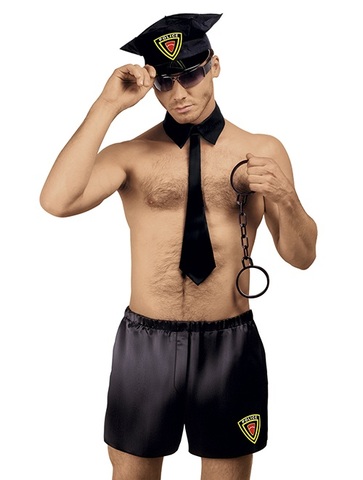 Костюм полицейского мужской: атласные шорты, воротник с галстуком, фуражка с эмблемой полиции. В комплекте: шорты, воротник, фуражка.