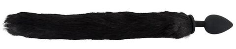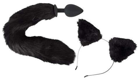 Игровой набор Pet Play Plug & Ears. Состоит из ободка с кошачьими ушками и анальной силиконовой пробки с длинным черным меховым хвостиком. Длина хвоста - 37,7 см.