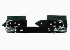 Оковы выполнены из натуральной кожи. Внутренняя подкладка мягкая, не доставит неприятных ощущений, благодаря тому что вся металлическая фурнитура спрятана за ней. За счёт карабинов легко разъединяются и быстро застёгиваются. Подойдут как для новичков, так и для профессионалов. Изделие декорировано ремнями из замши контрастного цвета. Посредине аксессуара расположено полукольцо из сварной фурнитуры. Оковы надежно фиксируются пряжками и ремнями, позволяющими выбрать нужный размер. Стильный аксессуар, отлично подходят для воплощения эротических БДСМ игр. Обхват наножников - 28 см., ширина - 6 см.