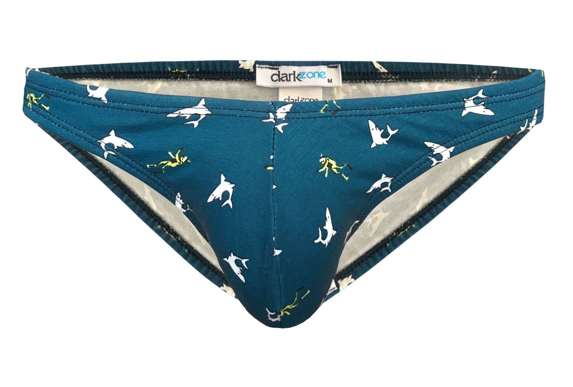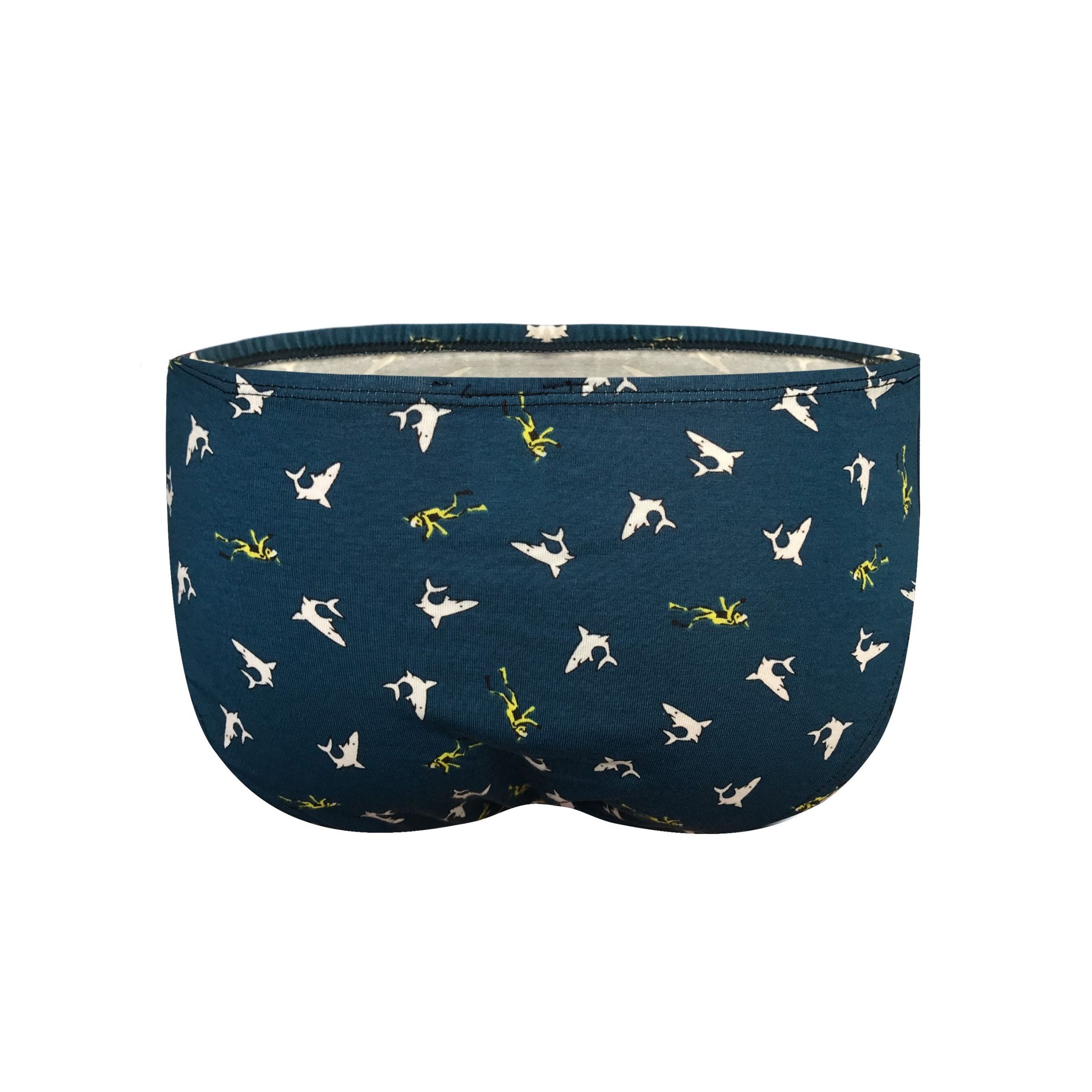 Изумрудные трусы-слипы с принтом в виде акул и водолазов.