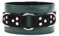 Ошейник выполнен из натуральной кожи изумрудного цвета, декорирован вставкой из черной замши, заклепками, металлическим кольцом и двумя полукольцами. Сзади аксессуар надежно фиксируется пряжкой, ремень позволяет выбрать нужный размер, подойдет на обхват от 33 до 45 см. Мягкий подклад из замши обеспечит комфортное пребывание в аксессуаре. Ширина - 6,5 см.
