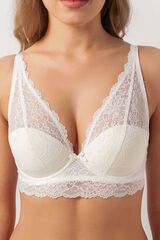 Бюстгальтер-бралетт на косточках с плотными чашками из фактурного кружева. Кружевная оборка вдоль пояса создает эффект бралетта. Регулируемые бретели и пояс. Внутренняя поверхность чашек из хлопка. Идеально сочетается с V образным вырезом и глубоким декольте для создания соблазнительного образа.