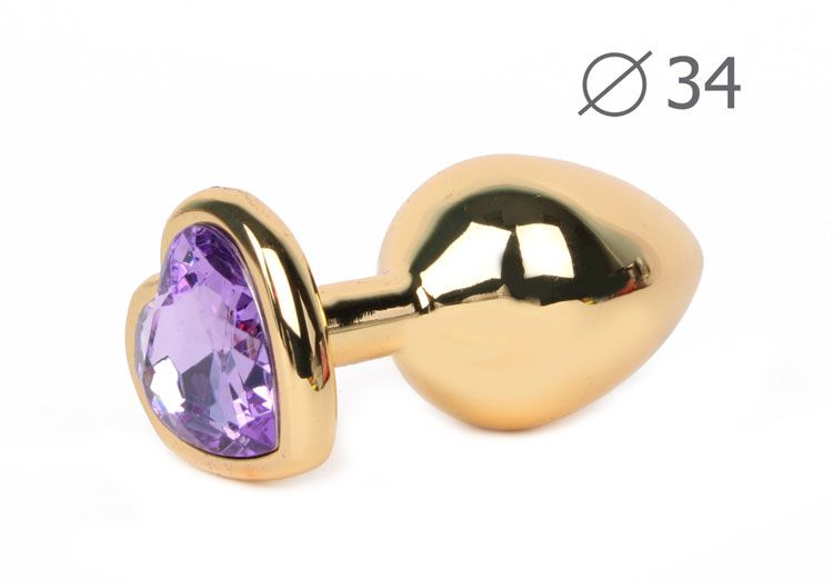 Каплевидная гладкая золотистая анальная втулка с кристаллом-сердечком сиреневого цвета - 8 см.
