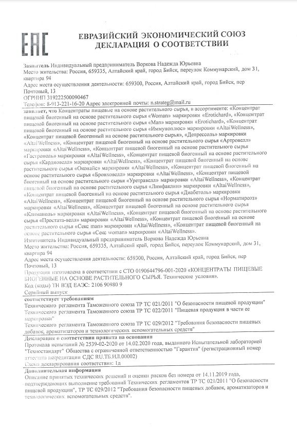 Биогенный комплекс растительных экстрактов Erotichar® sex women в капсулах способствует повышению либидо, увеличению сексуальной активности, обострению чувственных ощущений во время близости, улучшению состояния при хронической усталости, депрессии, нервном истощении и перенапряжении, уменьшению симптомов ПМС и менопаузы. Противопоказания: не рекомендуется лицам, страдающим индивидуальной непереносимостью компонентов, повышенной нервной возбудимостью, бессонницей, артериальной гипертензией; не рекомендуется превышать рекомендуемую суточную норму продукта (2 капсулы); противопоказан одновременный прием с алкоголем, т.к. снижает эффективность действующих веществ. Прием капсул возможен за 30-40 минут до употребления алкоголя. При заболеваниях сердечно-сосудистой системы совместный прием с алкоголем исключен.