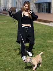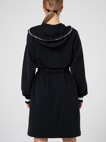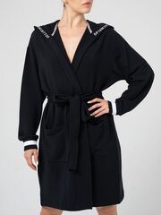 Универсальный кардиган в спортивном стиле из гладкого трикотажа с утепленной изнанкой с легким начесом. Лаконичный черный цвет освежают манжеты с белой полосой и отделка капюшона двумя видами тесьмы с принтом и вывязанным логотипом. Вместительные нашивные карманы. Пояс сзади удерживается кулиской.