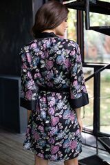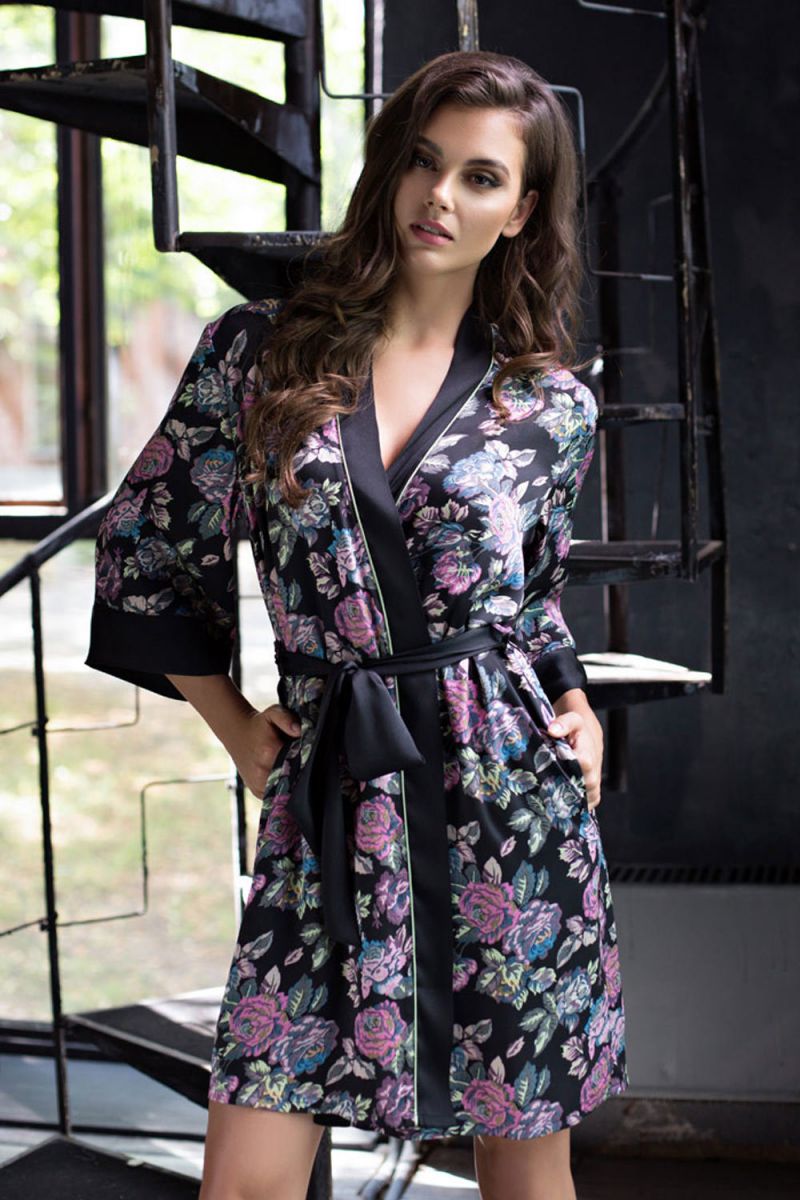 Кимоно прямого силуэта короткое с втачными рукавами из тонкого принтованного твила. Горловина, борт, манжеты рукавов и пояс выполнены из однотонного твила контрастного черного цвета, который отлично выделяет принт.