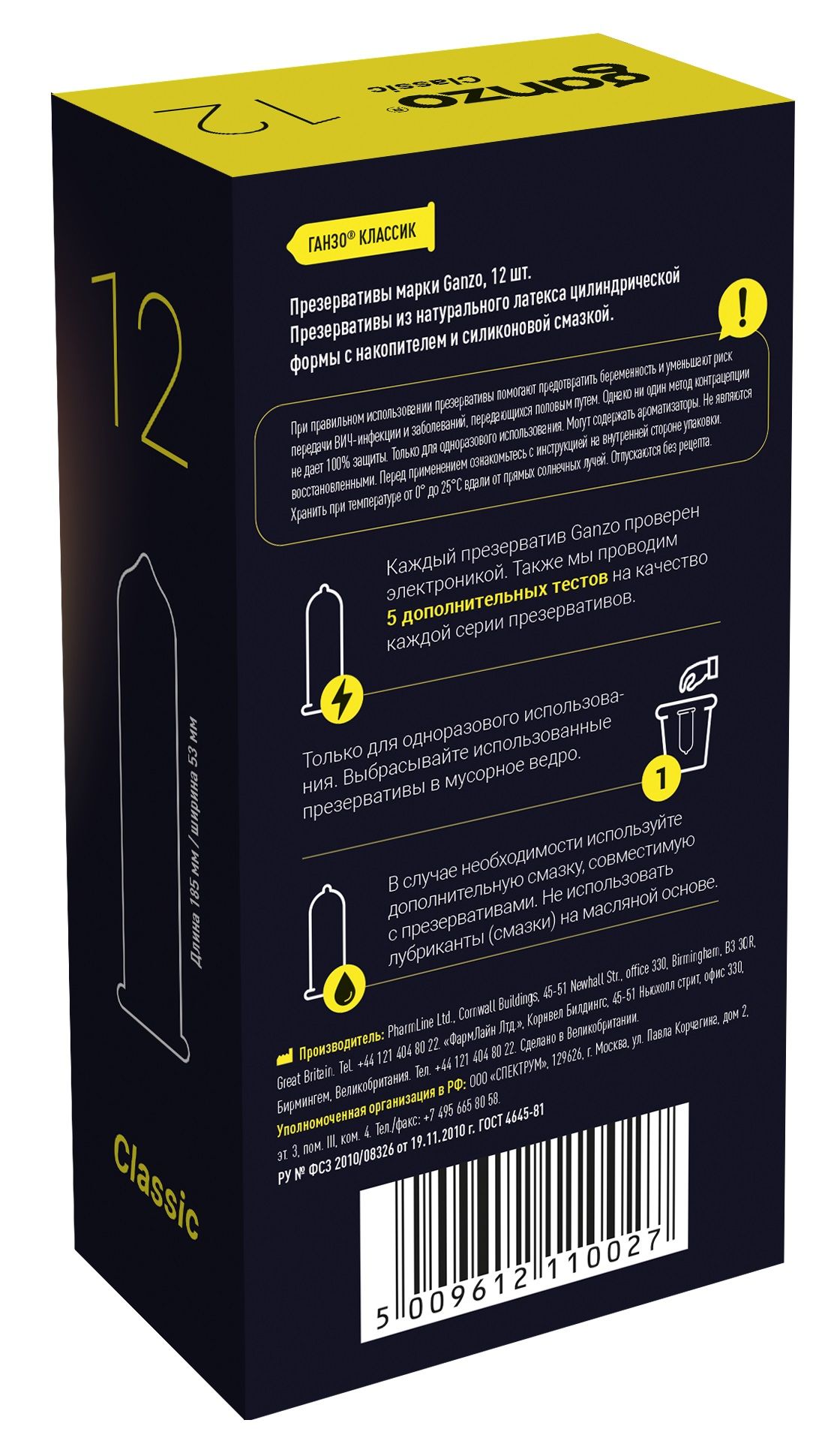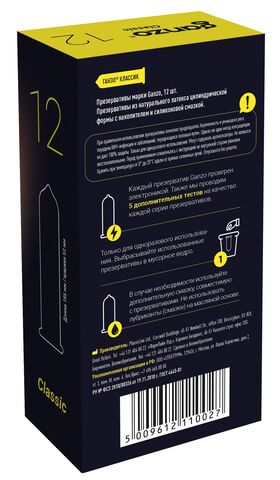 Прозрачные презервативы Ganzo Classic цилиндрической формы с накопителем и обильной силиконовой смазкой изготовлены из натурального высококачественного латекса. Проверены с использованием электростатической технологии для большей надежности. Толщина стенки - 0,06 мм.