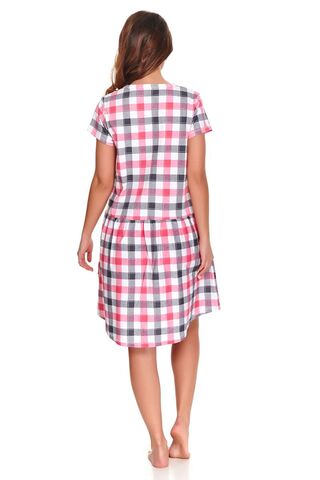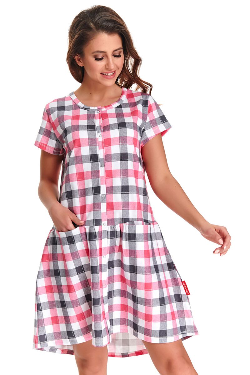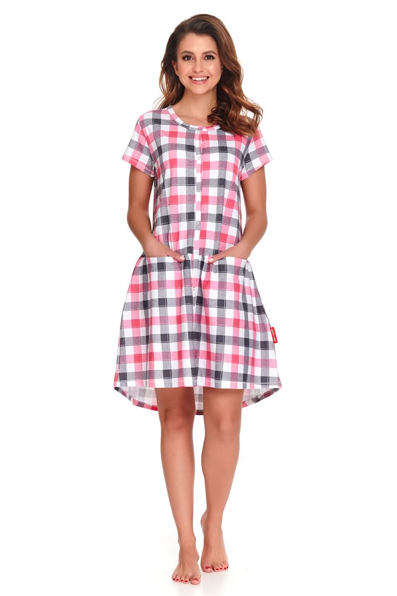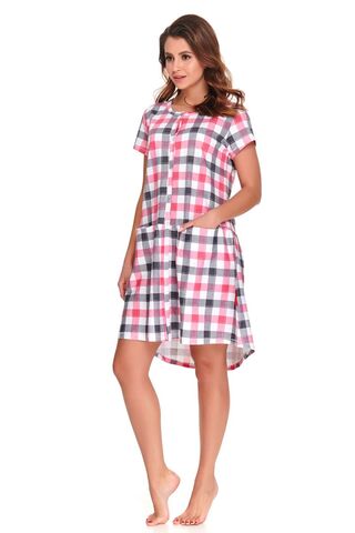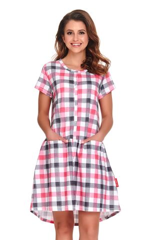 Яркое клетчатое домашнее платье свободного кроя выполнено из хлопкового полотна высшего качества. Модель с удлиненной спинкой, незаметными карманами по швам спереди, круглым вырезом горловины и планкой на кнопках. Идеальный вариант не только для сна, но и для домашнего отдыха.