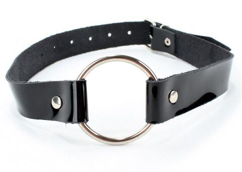 Кляп выполнен из натуральной лакированной кожи черного цвета. Кольцо из прочного металла закреплено ремешками. Размер регулируется пряжкой сзади, подойдет на обхват от 33 до 50 см. Надежный кляп для БДСМ игры. Диаметр кольца - 4,5 см.