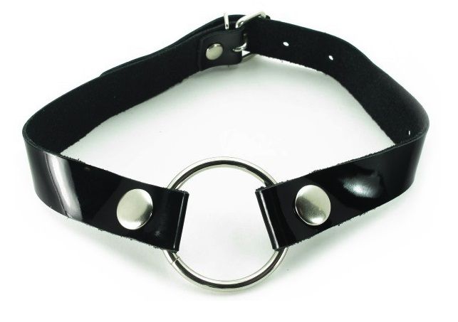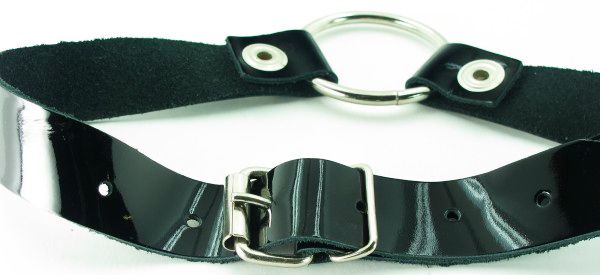 Кляп выполнен из натуральной лакированной кожи черного цвета. Кольцо из прочного метала закреплено ремнями на кнопках, позволяющими произвести смену кольца, размер регулируется пряжкой сзади. Стильный кляп для ваших откровенных фантазий! Ширина ремешка - 2 см.