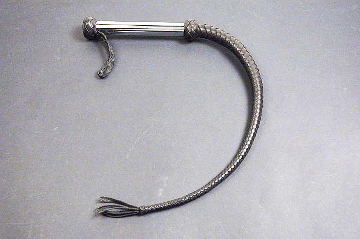Кнут черный с хромированной рукоятью с 2-мя ограничительными плетенными бобышками и петлей для фиксации руки. Рукоять переходит в кнутовище на конус. Выполнена 8-и полосным плетением елочкой.