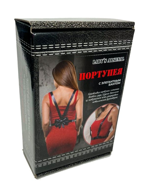 Кокетливая портупея с кожаным бантом сзади. Изделие выполнено из натуральной кожи, декорировано металлической фурнитурой. Подойдет на размер S-M.