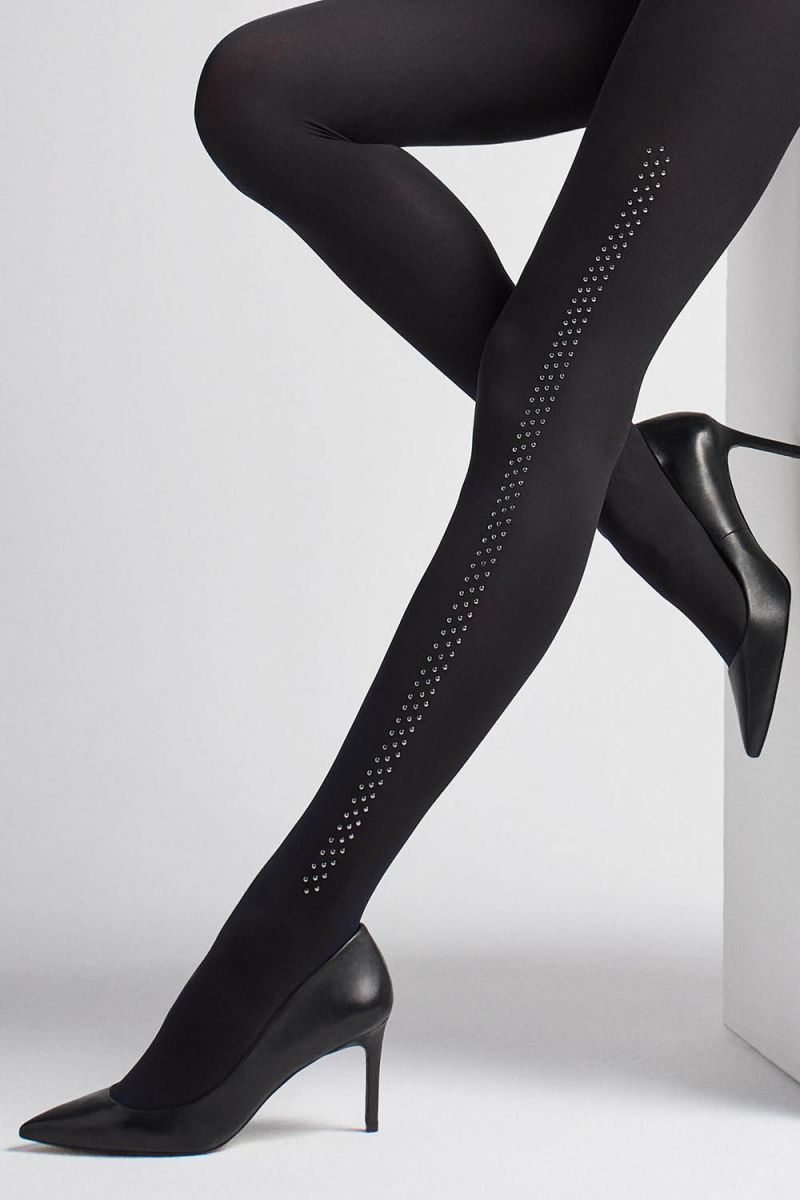 Колготки Brads выполнены из микрофибры по 3D-технологии, декорированы металлическими заклепками. Плоские швы, хлопковая ластовица, невидимое усиление мыска, широкий кружевной пояс на силиконовой основе. Плотность - 60 ден.