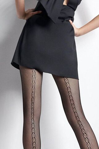 Колготки Charly в мелкую сеточку с декоративными стрелками сзади. Небольшая ластовица, удобный эластичный пояс и невидимое усиление мыска.