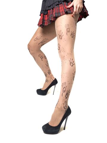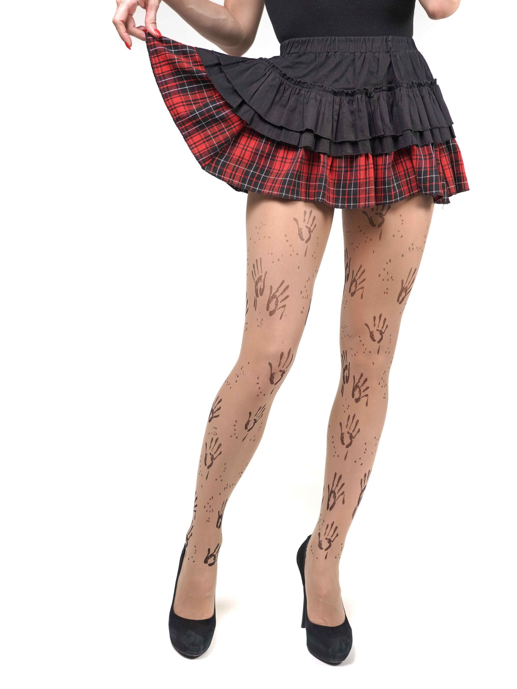 Колготки с принтом в виде ладошек. Принт не стирается, не выгорает со временем. Можно стирать в стиральной машине. Крепкие, подойдут на рост от 145 до 180 см. Плотность - 40 ден.