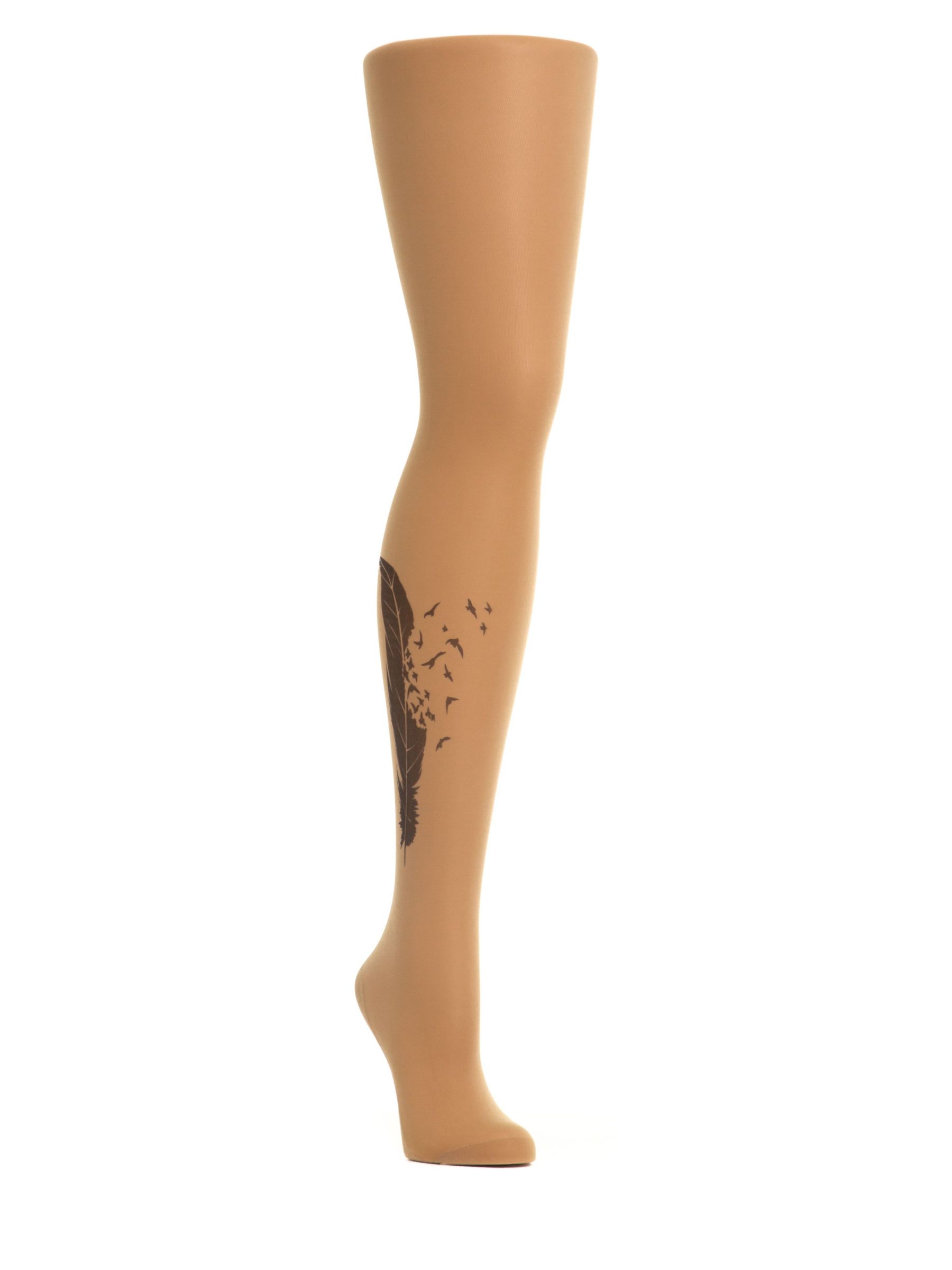 Колготки с принтом в виде перышка и птиц. Принт не стирается, не выгорает со временем. Можно стирать в стиральной машине. Крепкие, подойдут на рост от 145 до 180 см. Плотность - 40 ден.