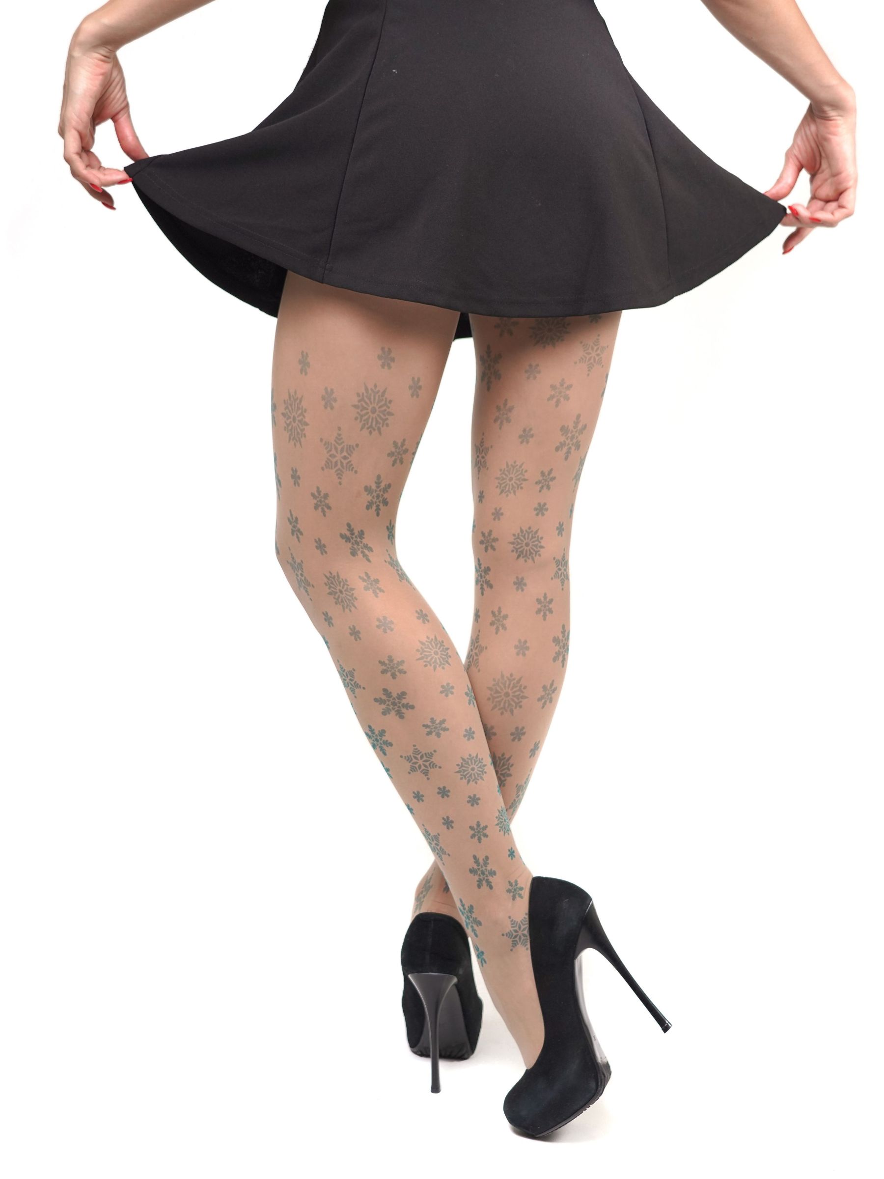 Колготки с принтом в виде снежинок. Принт не стирается, не выгорает со временем. Можно стирать в стиральной машине. Крепкие, подойдут на рост от 145 до 180 см. Плотность - 40 ден.