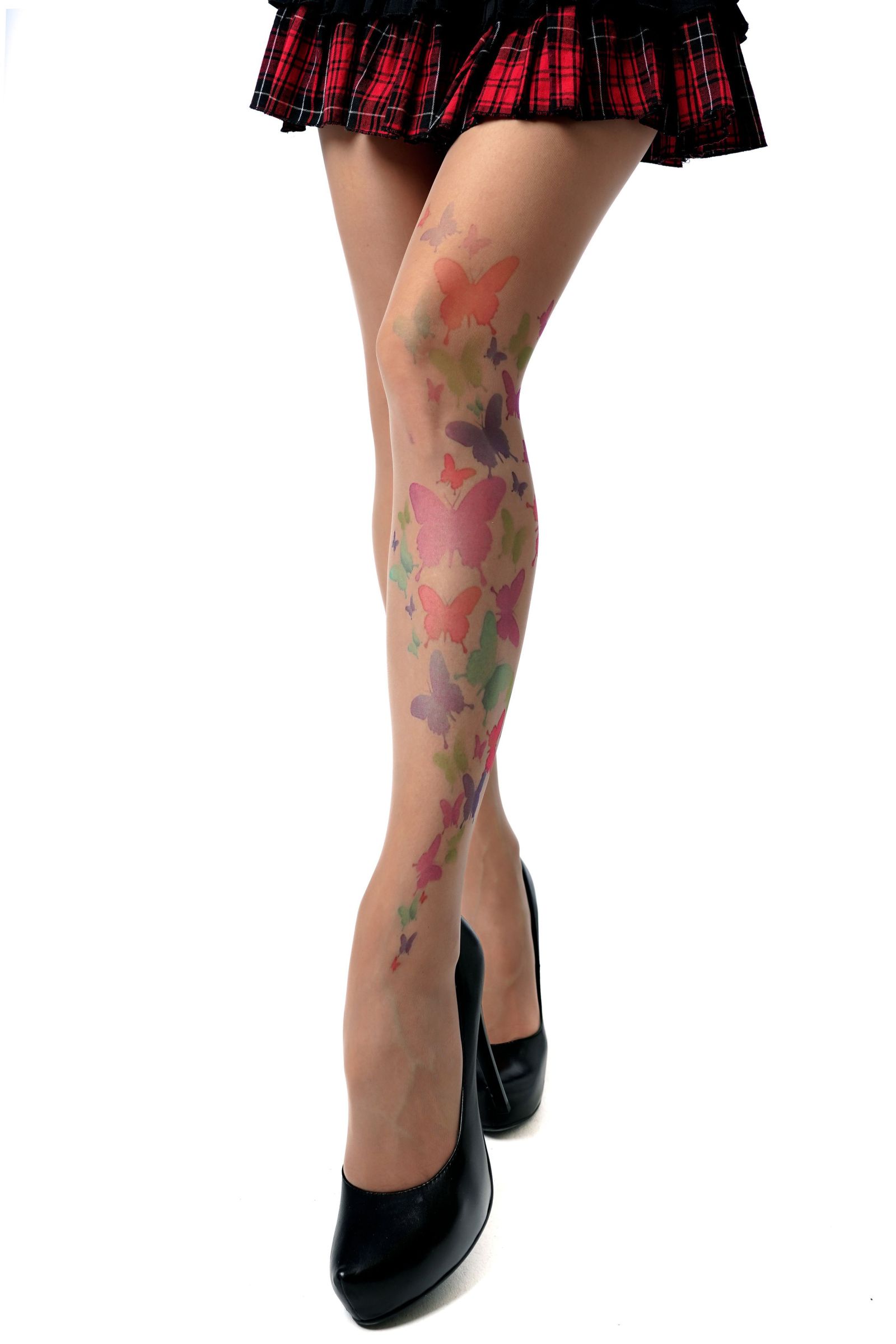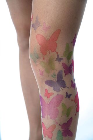 Колготки с принтом в виде цветных бабочек на левой ножке. Принт не стирается, не выгорает со временем. Можно стирать в стиральной машине. Крепкие, подойдут на рост от 145 до 180 см. Плотность - 40 ден.