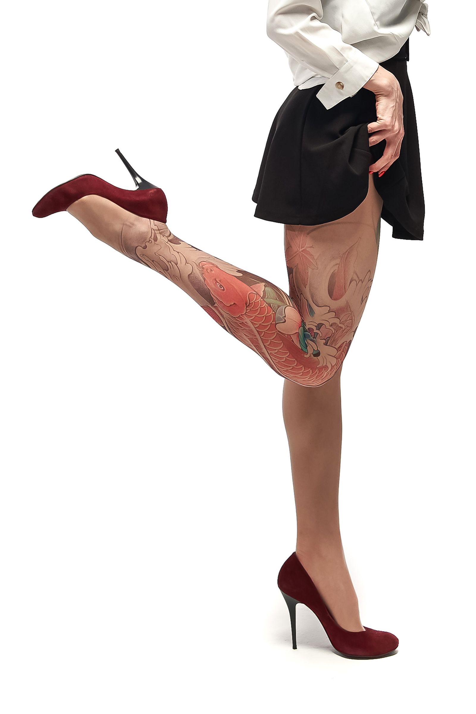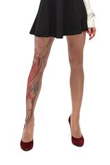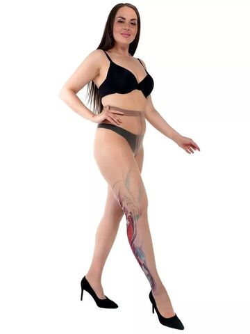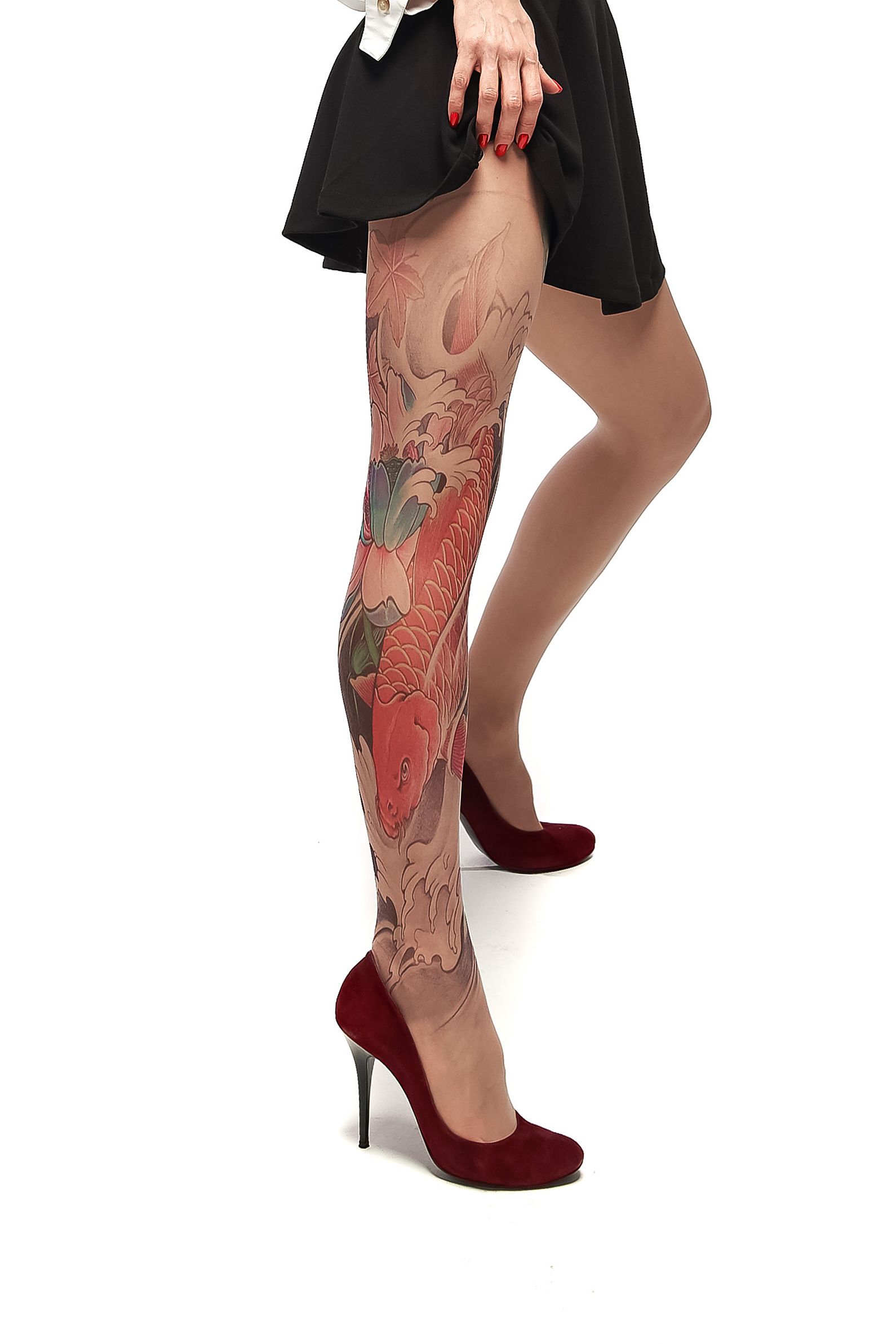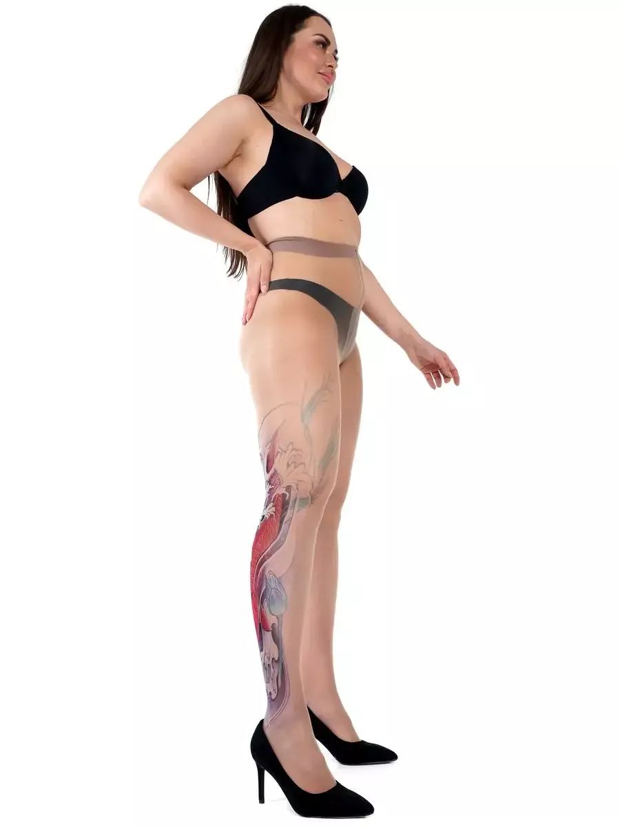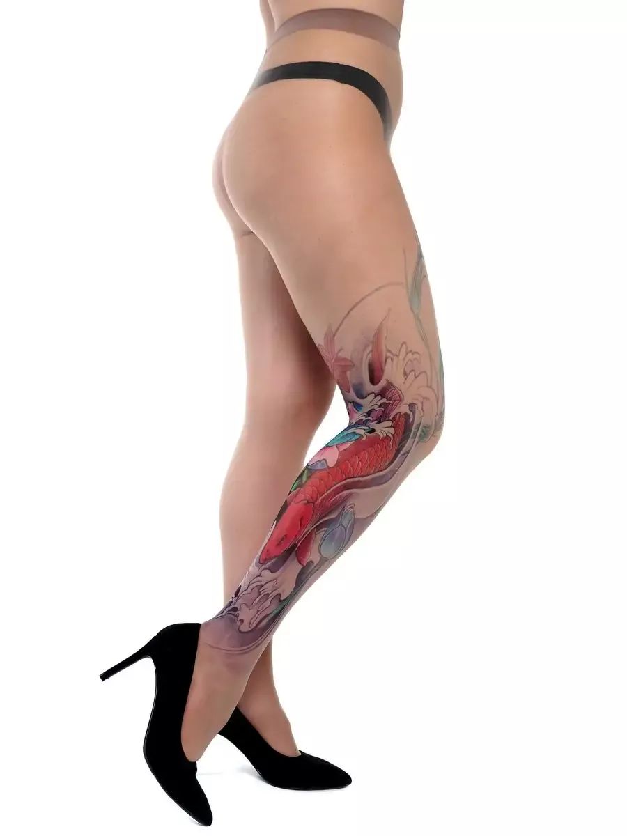 Колготки +size с принтом в виде красного карпа кои на правой ножке. Принт не стирается, не выгорает со временем. Можно стирать в стиральной машине. Крепкие, подойдут на рост от 145 до 180 см. Плотность - 40 ден.
