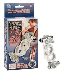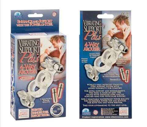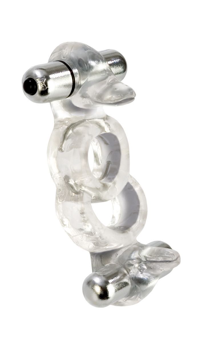 Кольцо для любовников, которые любят всё и сразу! Классическое кольцо хорошо поддерживает эрекцию, так как внутрь вживлены стальные дуги, вторая петля кольца - предназначена для мошонки мужчины, третье удовольствие - вибрирующая уточка для стимуляции клитора партнерши, а четвертое - вторая вибрирующая уточка для стимуляции входа в анус!