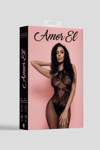 Боди-комбинезон с высоким воротником и завязывающимися бретелями. Дизайн выполнен в виде сетки с кружевным рисунком. Благодаря использованию большего количества нейлона белье сохраняет очертания, не деформируется, растягивается и выгодно облегает фигуру.