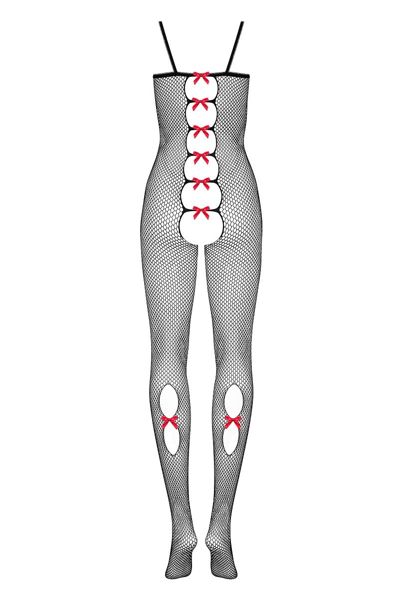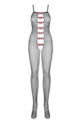 Боди-комбинезон в мелкую сеточку, спереди украшен атласными бантами.