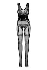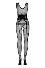 Соблазнительный боди-комбинезон в мелкую сеточку, рисунок эмитирует корсет и чулочки.