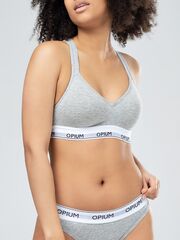 Комфортный топ-бра в спортивном стиле. Выполнен из хлопка с эластаном. Чашки дублированы поролоном, что позволяет красиво оформить грудь. Топ не стесняет движений, надежно фиксируется на теле благодаря удачной конструкции и мягкой брендированной резинке