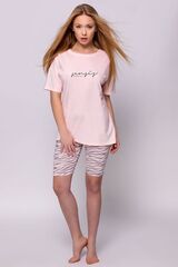 Комплект Anette состоит из футболки с надписью на груди и принтованных велосипедок. Футболка свободного кроя, с короткими рукавами и круглым вырезом горловины. В комплекте: футболка, шорты.