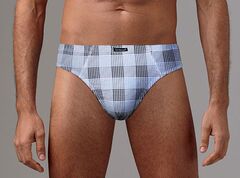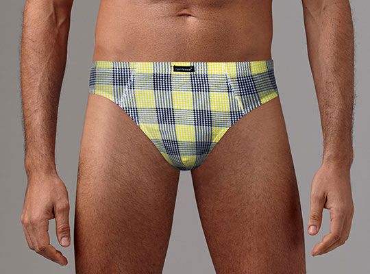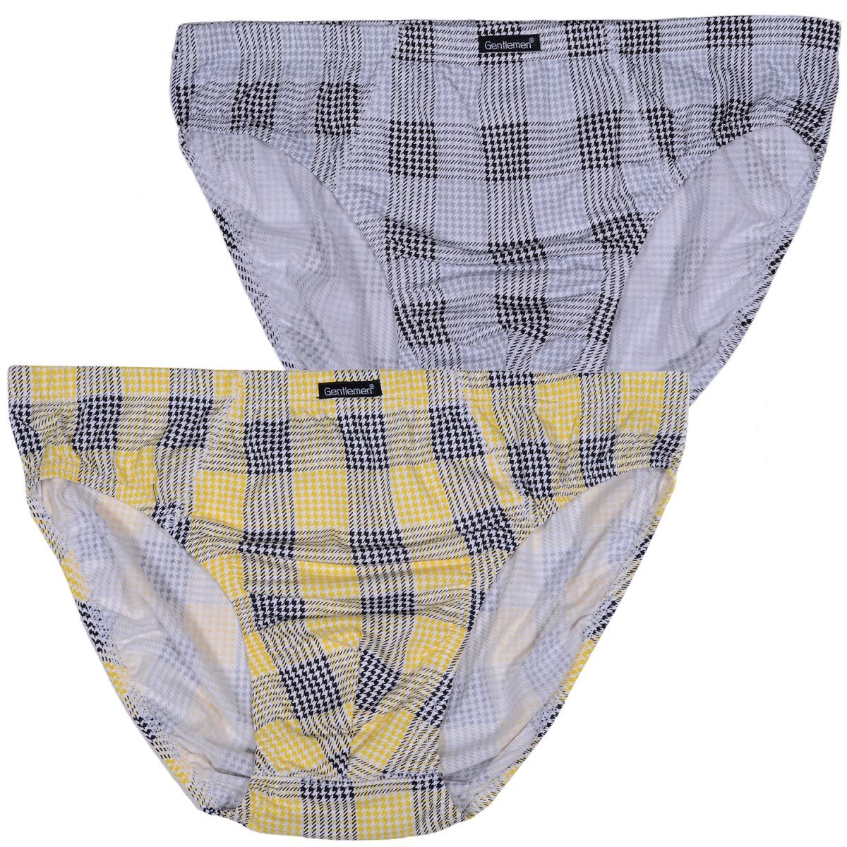 Мужские трусы-слип с принтом в клетку. Модель анатомического кроя без центрального шва спереди. Трусы также отличаются эластичным втачным поясом. В комплект входят 2 трусов разной расцветки - серые и желтые.