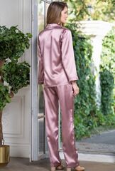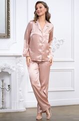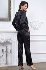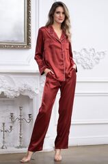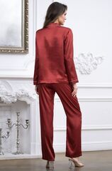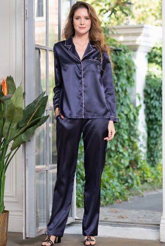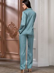 Комплект состоит из жакета с центральной застежкой на пуговицах, с длинными рукавами и брюк. Комплект выполнен из искусственного шелкового полотна с атласным блеском. Рукава, борт, карманы жакета и низ брюк декорированы контрастным кантом. В комплекте: жакет, брюки.