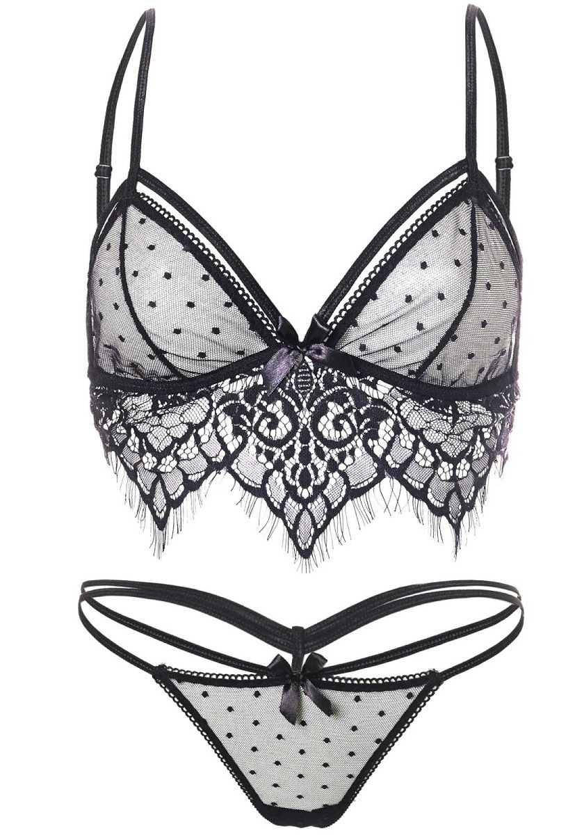Комплект белья от Leg Avenue. В комплект входит полупрозрачный лиф в горошек, с кружевной бахромой-окантовкой внизу, трусики-стринги в швейцарский горошек, декорированные тонкими лентами на животе. В комплекте: лиф, трусики-стринги.