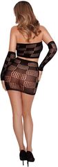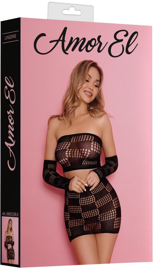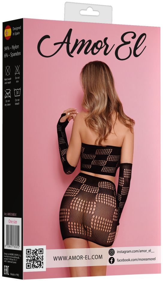 Комплект соблазнительного сетчатого белья, состоящего из откровенного топа, отдельных рукавов и короткой юбки. Благодаря использованию большего количества нейлона, белье сохраняет очертания, не деформируется, растягивается и выгодно облегает фигуру. В комплекте: топ, рукава, юбка.