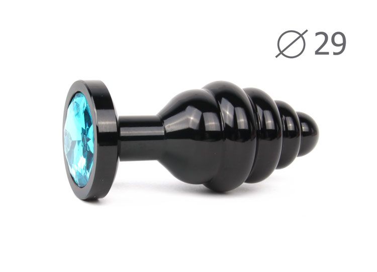 Коническая ребристая черная анальная втулка с голубым кристаллом - 7,1 см.