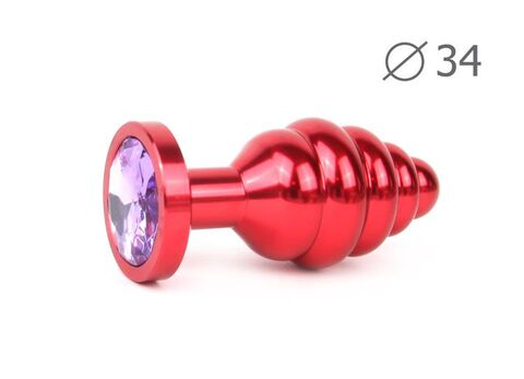 Коническая ребристая красная анальная втулка с сиреневым кристаллом - 8 см.